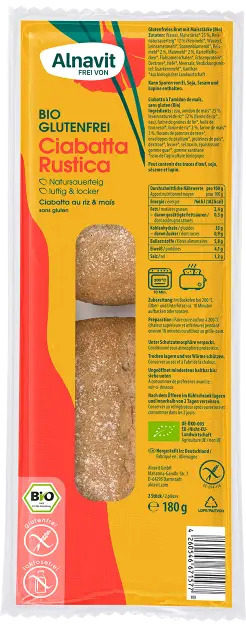 Ciabatta rustica fara gluten de la Alnavit este o paine usoara, pufoasa, bogata in fibre. Ambalajul face posibila pastrarea painii un timp destul de indelungat.