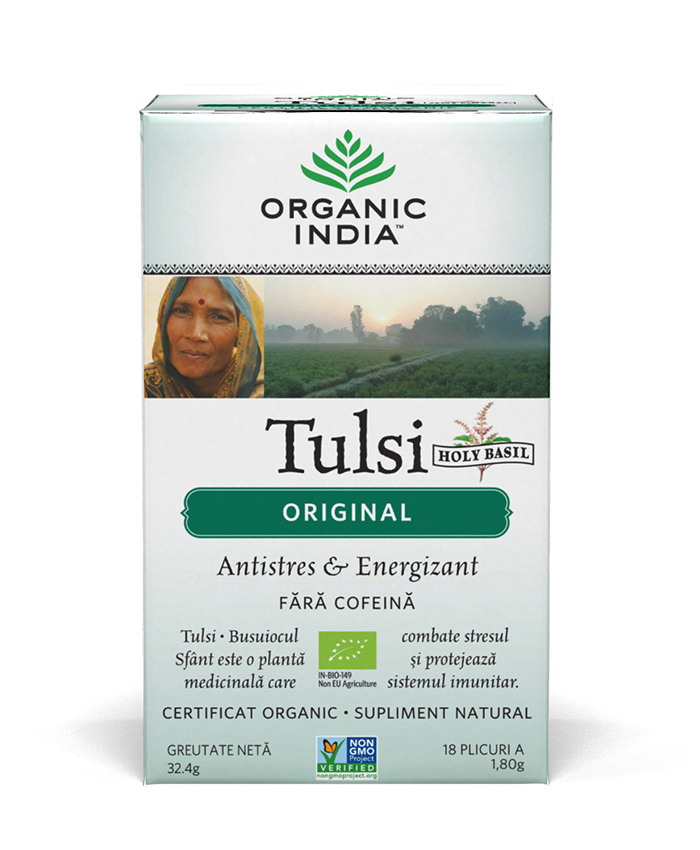 ORGANIC INDIA Ceai Tulsi (Busuioc Sfant) Original, Antistres Natural & Energizant este un produs 100% Certificat Organic si nu contine organisme modificate genetic. Nu contine si nu sunt folosite in niciun stagiu al productiei pesticide sintentice, erbicide, ingrasaminte sau alte tratamente chimice.