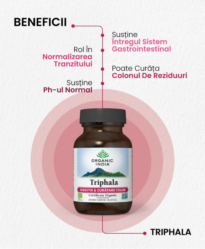 Triphala este o formula revigoranta si detoxifianta ce poate curata colonul si sustine sanatatea intregului tract gastrointestinal – poate previne constipatia, poate regla nivelul pH-ului din intestine, poate sustine absorbtia nutrientilor la nivelul intestinelor, poate contribui la indepartarea depozitelor de grasime si a toxinelor din intestine. Datorita efectului laxativ, Triphala poate avea actiune benefica in ameliorarea simptomelor sindromului de colon iritabil, in situatiile in care e asociat cu constipatia. In medicina ayurvedica, Triphala este recomandata si pentru stimularea sistemului imunitar, combaterea balonarii (efect carminativ), tratamentul diabetului, diverse afectiuni ale ochilor, imbunatatirea circulatiei, imbunatatirea functionarii glandelor suprarenale si pentru efectul hepatoprotector.