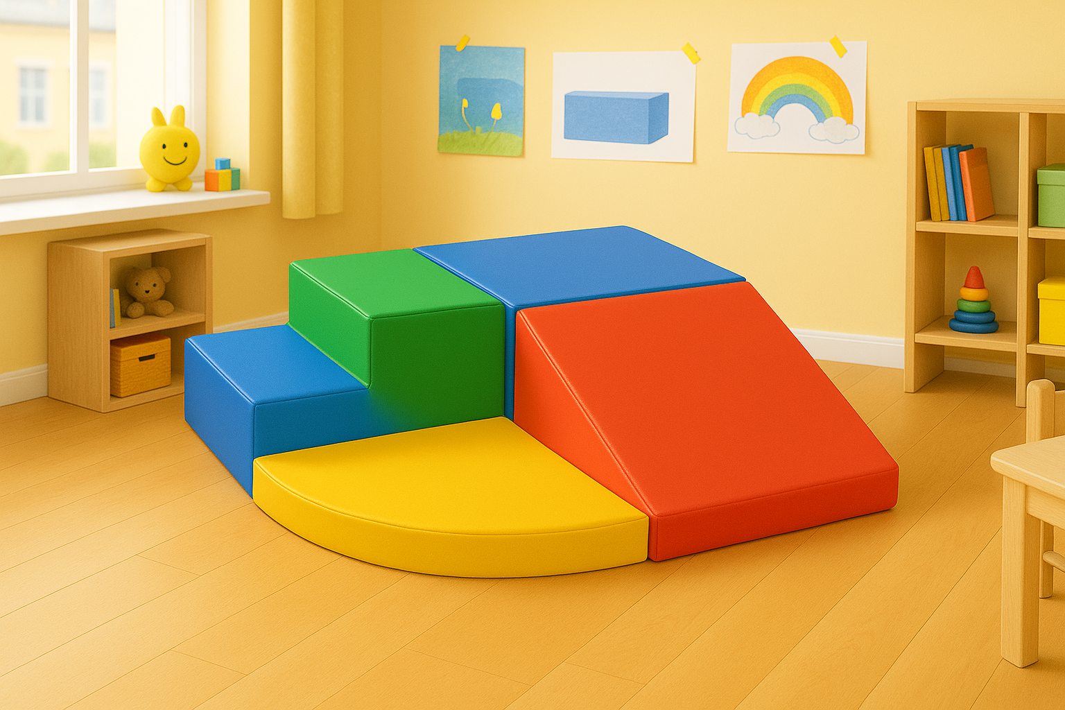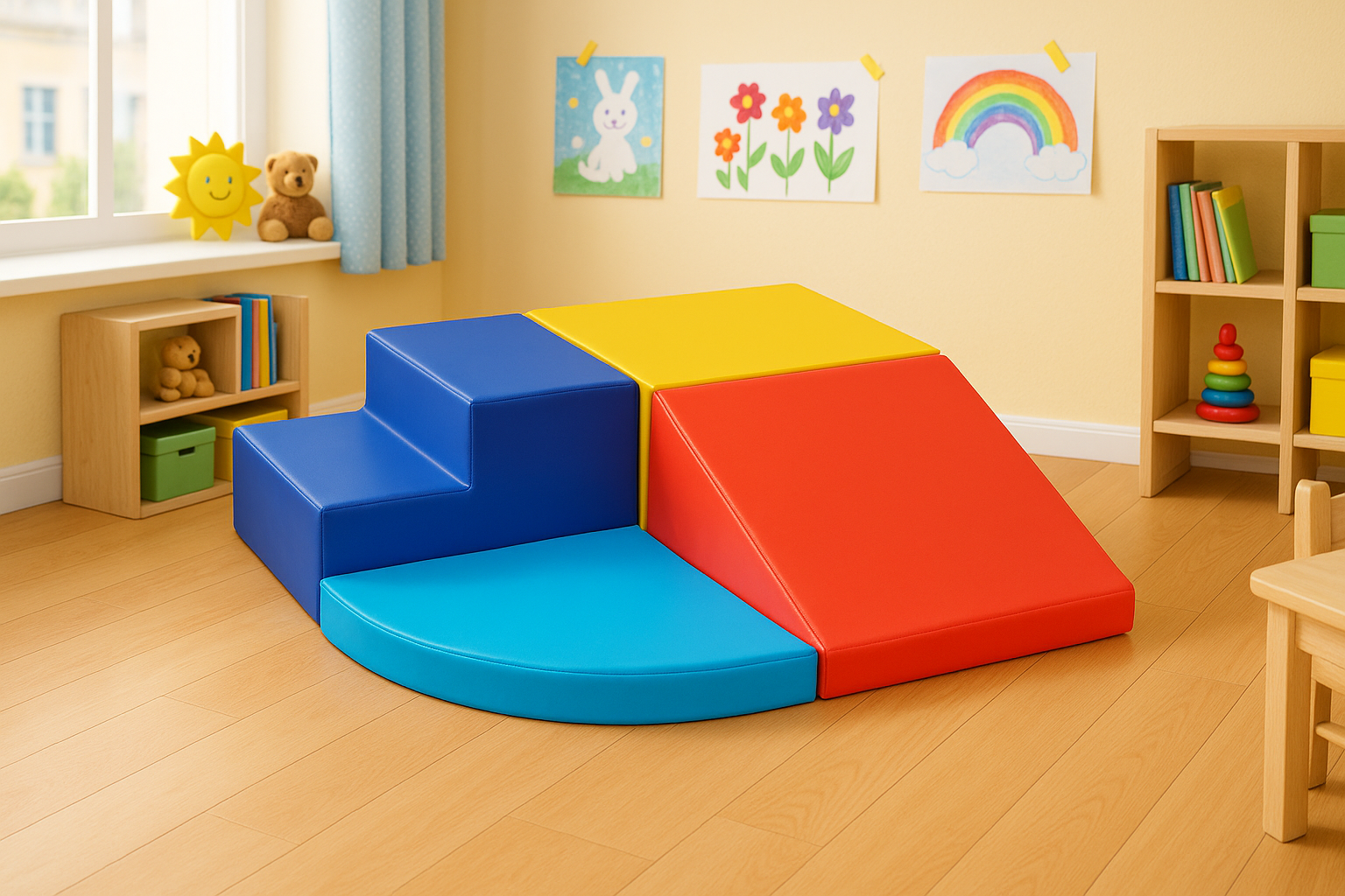 Realizat din spumă densă acoperită cu material PU durabil și lavabil, sistemul este gata de utilizare imediat – fără asamblare. Se curăță rapid, fiind ideal pentru copii activi de 1–3 ani.