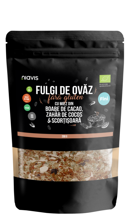 Fulgi de Ovaz Fini Fara Gluten cu Miez din Boabe de Cacao, Zahar de Cocos si Scortisoara Ecologici/Bio 200g