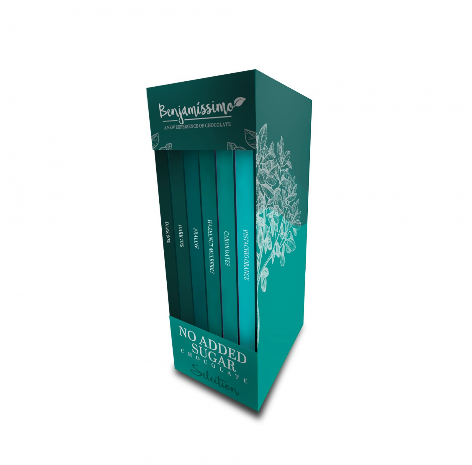 Cutie cadou cu 6 ciocolate Benjamissimo toate fara zahar adaugat.