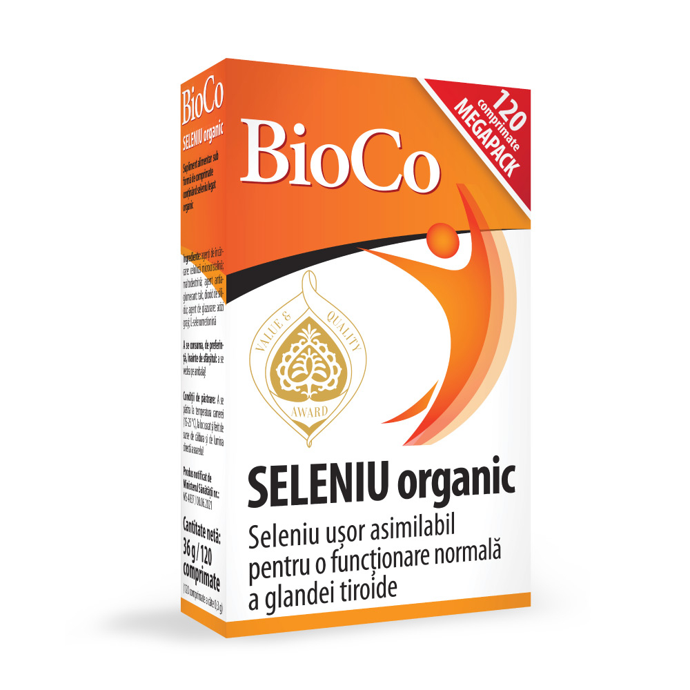 BioCo SELENIU organic, comprimate filmate_x000D_\n_x000D_\nProducătorul operează un sistem de siguranţă alimentară certificat conform standardului ISO 22000 şi liniilor directoare ale Bunei Practici de Fabricaţie (GMP)!_x000D_\n_x000D_\nSupliment alimentar sub formă de comprimate conținând seleniu legat organic._x000D_\n_x000D_\nBioCo SELENIU organic conține o cantitate mare de seleniu în 100 μg de substanță activă, necesară pentru funcționarea normală a sistemului imunitar și glandei tiroide, exclusiv sub formă de L-selenometionină legată organic, ușor de asimilat._x000D_\n_x000D_\nSeleniul organic provenind din L-selenometinină este mai ușor de asimilat decât compușii anorganici ai seleniului (cum sunt selenitul de sodiu, selenatul de sodiu)._x000D_\n_x000D_\nSeleniul contribuie la:_x000D_\n• funcționarea normală a glandei tiroide,_x000D_\n• menținerea stării normale a părului și unghiilor,_x000D_\n• funcționarea normală a sistemului imunitar,_x000D_\n• protejarea celulelor împotriva stresului oxidativ.