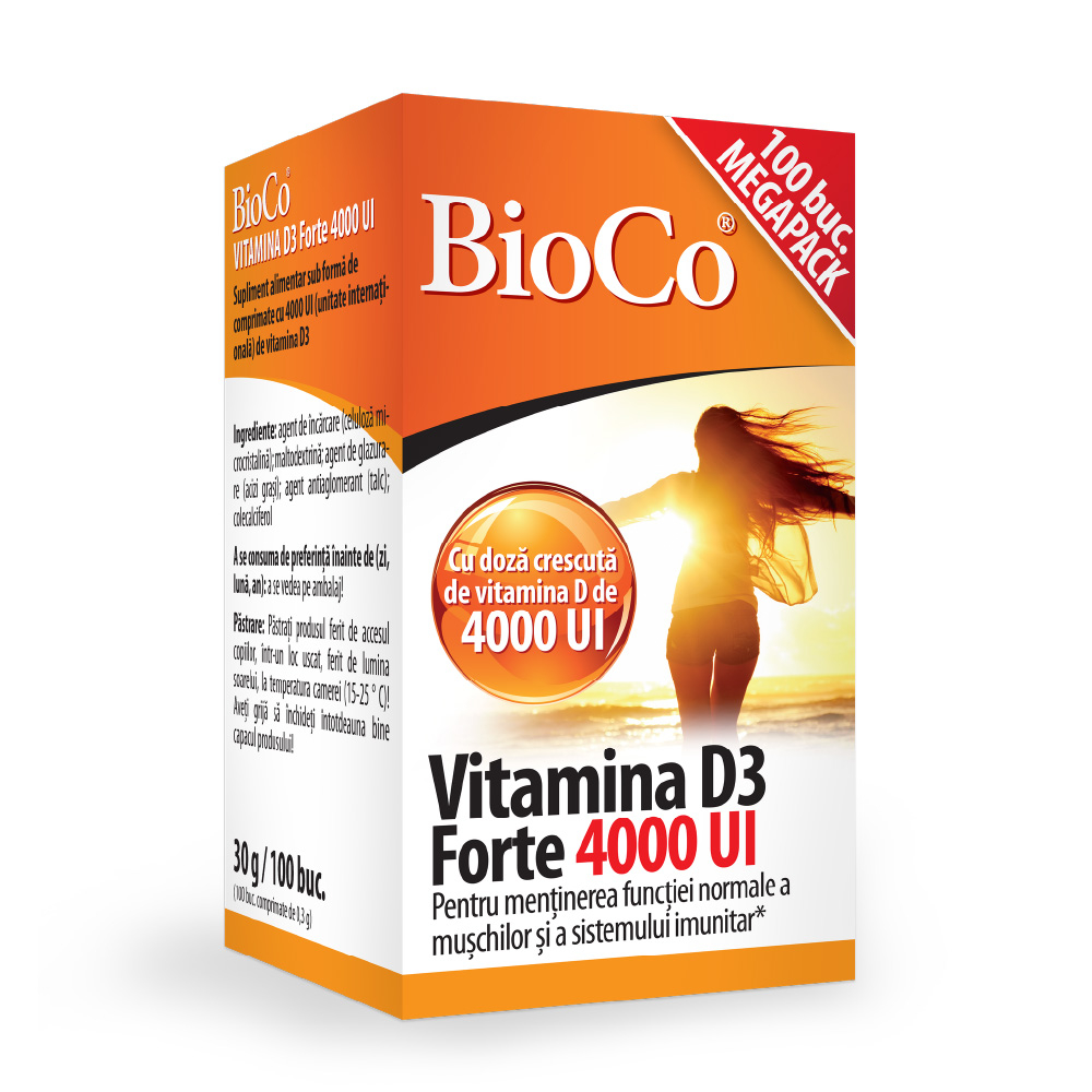 BioCo® Vitamina D3 Forte 4000 UI, comprimate filmate_x000D_\n_x000D_\nProducătorul operează un sistem de siguranţă alimentară certificat conform standardului ISO 22000 şi liniilor directoare ale Bunei Practici de Fabricaţie (GMP)!_x000D_\n_x000D_\nSupliment alimentar sub formă de comprimate._x000D_\n_x000D_\nProdusul conține de două ori cantitatea de vitamina D3 (100 μg pe comprimat în loc de 50 μg) față de comprimatele BioCo vitamina D3, echivalent a 4000 UI, unități internaționale._x000D_\n_x000D_\nUtilizarea acestuia este recomandată tuturor celor care prin consumul unor cantități semnificative de vitamina D3, doresc să mențină un sistem osos, dinți și funcția mușchilor normală._x000D_\n_x000D_\nVitamina D contribuie la:_x000D_\n• menținerea sănătății sistemului osos, dinților,_x000D_\n• menținerea funcției normale a sistemului muscular,_x000D_\n• funcționarea normală a sistemului imunitar,_x000D_\n• absorbția și utilizarea normală a calciului și fosforului.