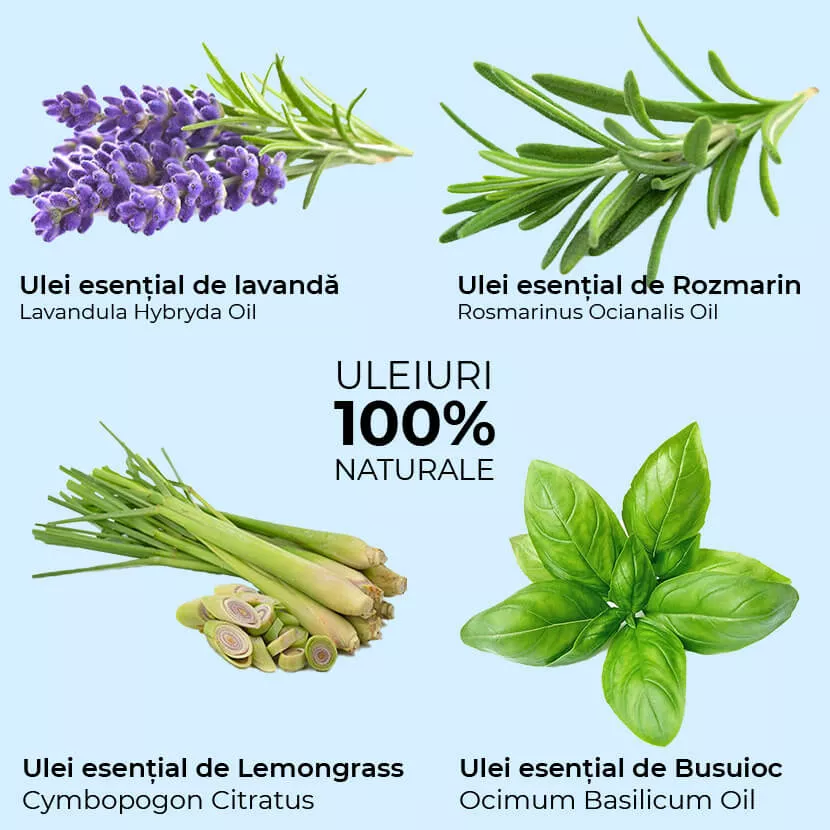 Conține 4 uleiuri esențiale: lavandă, rozmarin, lemongrass, busuioc, ce țin țânțarii la distanță. Îmbogățit cu pantenol pentru hidratarea pielii.