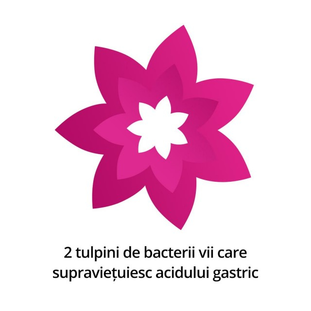 Informații nutriționale (per 2 capsule): 1 miliard de bacterii vii (1 x 109 UFC), viabile pe toată perioada de valabilitate, echivalent cu 1,2 miliarde per gram (1,2 x 109 UFC), vitamina A 320 μg.