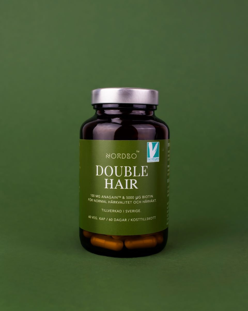 Double Hair (Complex de Biotina) NORDBO - Regenerare Par - 60 capsule NORDBO Double Hair combină extractul organic de mazăre AnaGain cu biotina și este dezvoltat pentru a stimula foliculii de păr, pentru a reduce căderea părului și pentru a îmbunătăți calitatea si stralucirea părului. AnaGain este un extras din lăstari de mazăre, care sunt deosebit de bogati în substanțe bioactive care activează celulele din foliculii de păr. Biotina ajută la regenerarea si menținerea părului normal. Produsul este fabricat în Suedia și este certificat cu I'm Vegan de Către Djurens Rätt. Citeste mai mult despre AnaGain descarcand gratuit studiul clinic din sectiunea Download!