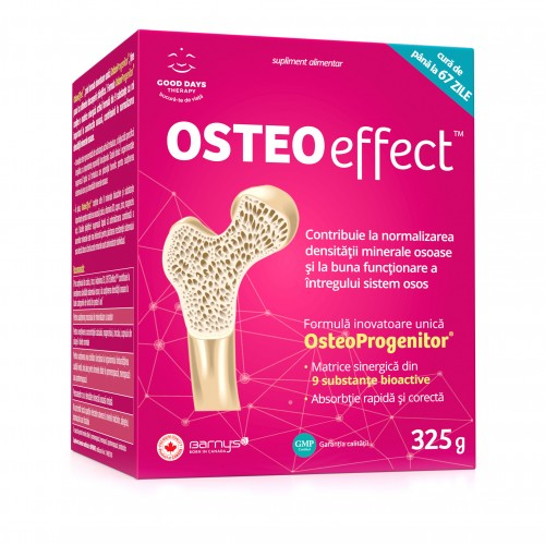 OSTEOeffect™ este un supliment alimentar cu o formulă concepută la standarde canadiene în acord cu ultimele descoperiri științifice, recomandat pentru sistemul osos. Concepută de specialiștii canadieni, formula unică OsteoProgenitor® este echilibrată și optim dozată, constând într-o matrice sinergică activă formată din 9 substanțe bioactive pentru întreaga structură osoasă a organismului. Inovația este reprezentată de substanța activă trehaloza, o diglucidă specifică drojdiilor, cu importante proprietăți funcționale.
